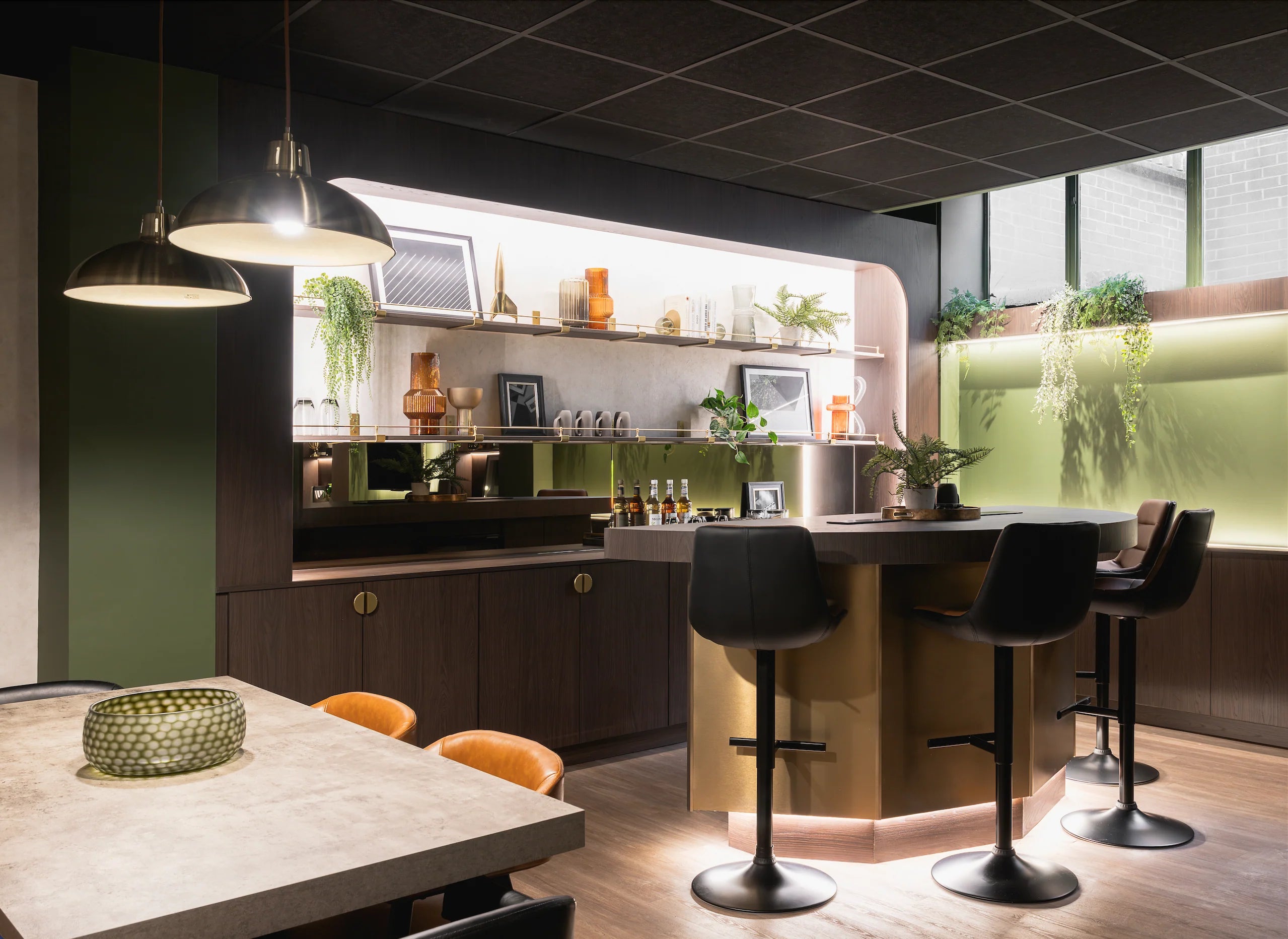 Originally, this area was intended to be a wine bar - complete with shelving, racks, and storage. But due to HR restrictions, alcohol wasn’t an option. Rather than scrapping the concept, we reimagined the design entirely and transformed it into a bespoke coffee bar and casual collaboration hub.