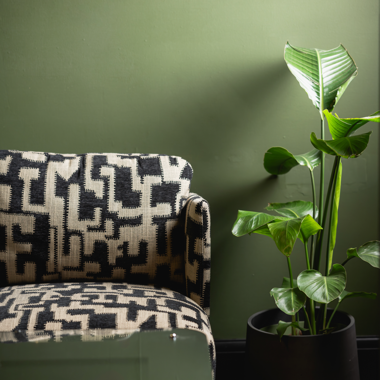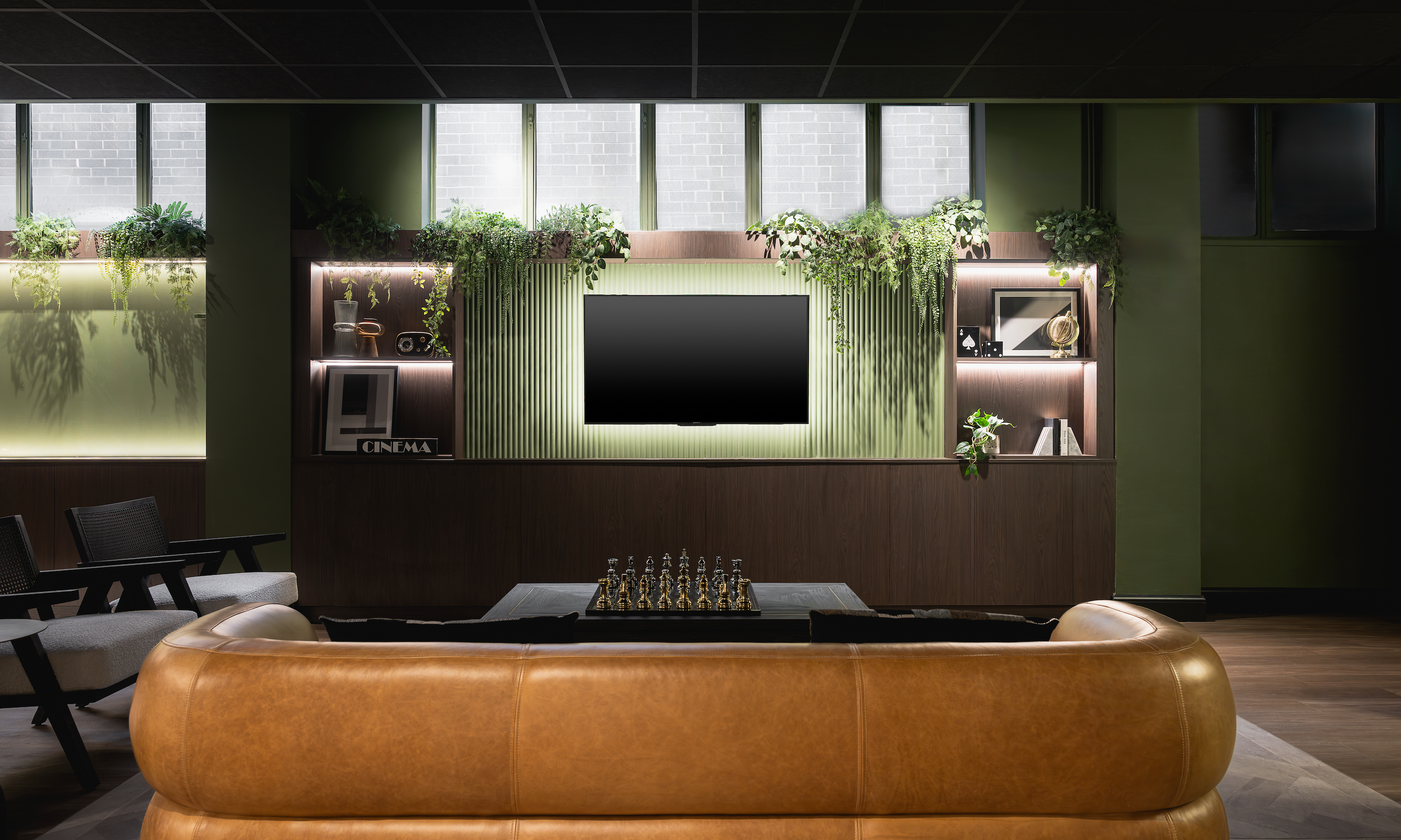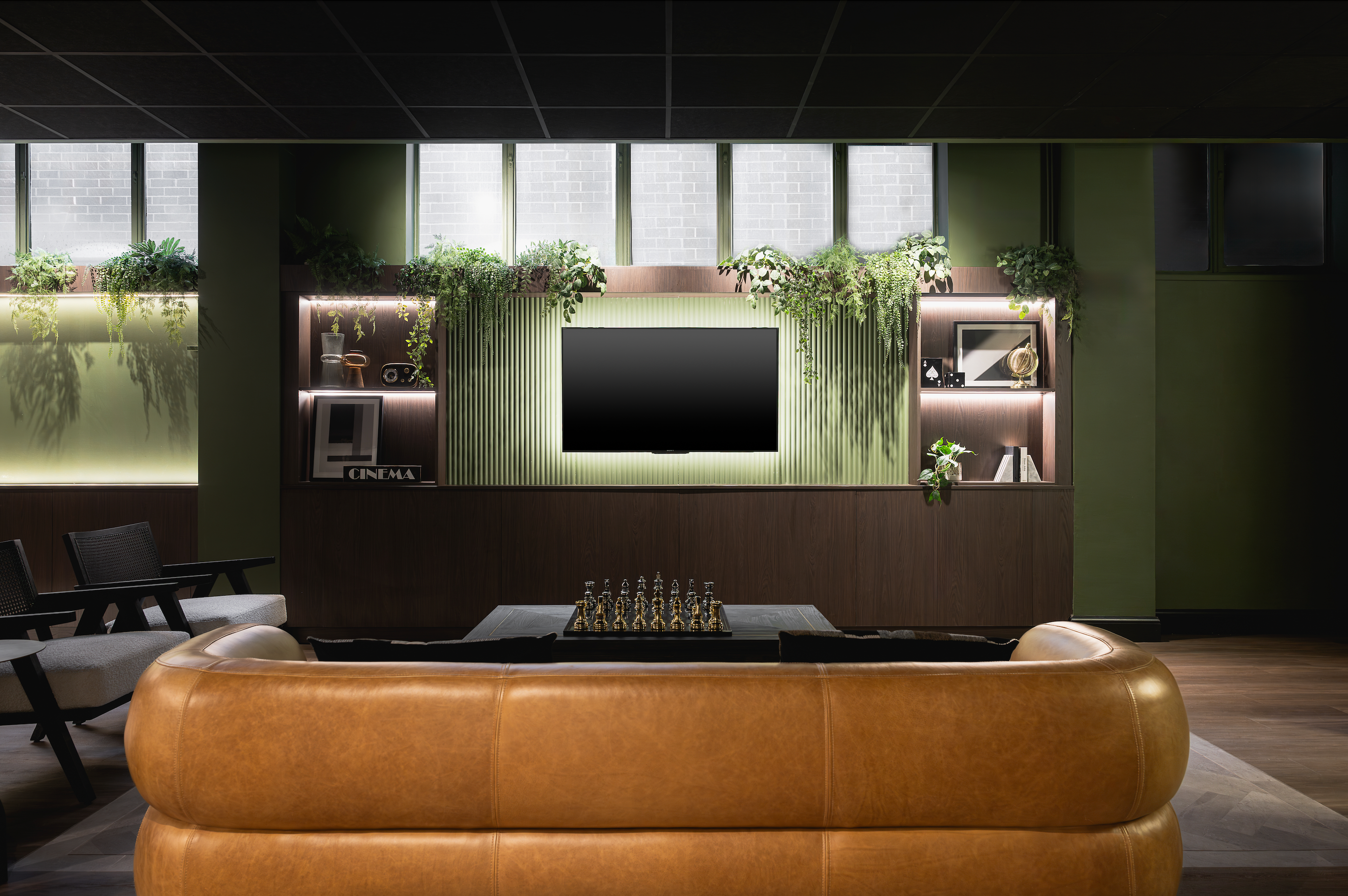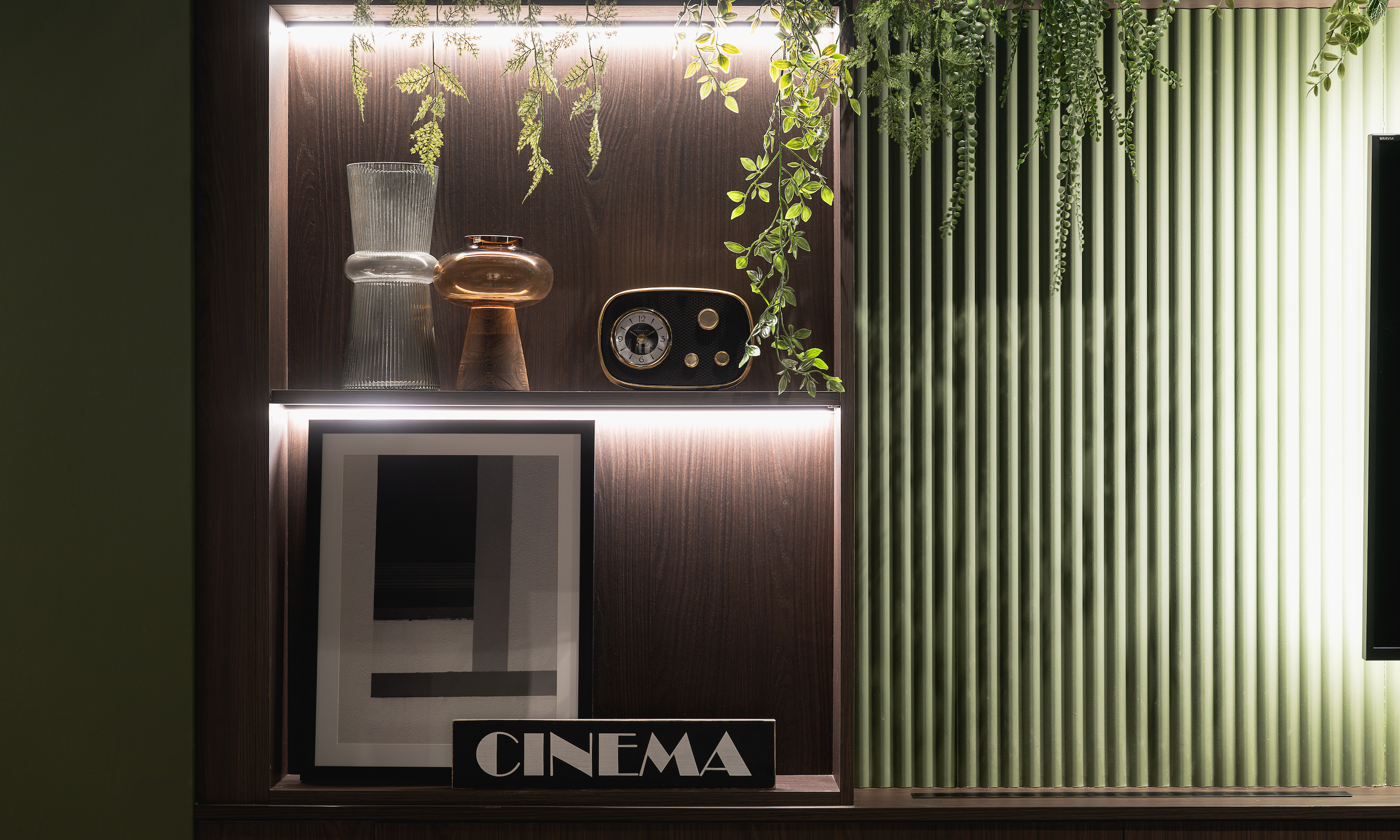 To soften the strong architectural lines, we introduced planters with trailing greenery, adding organic shapes and textures that also disguised the base of the windows. Walnut Egger panelling and integrated shelf lighting tied the look together, layering rich tones with a luxe finish.