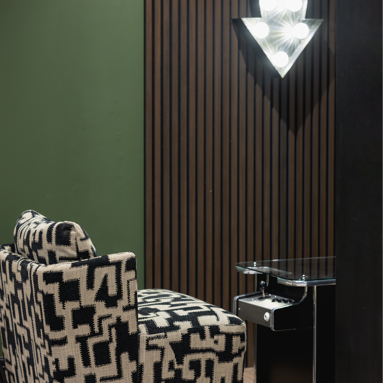 The chosen palette of deep greens, soft greys, and brass accents created a sophisticated speakeasy atmosphere. LVT flooring with brass inlays not only elevated the design but also became a clever way to define each functional zone without adding walls.