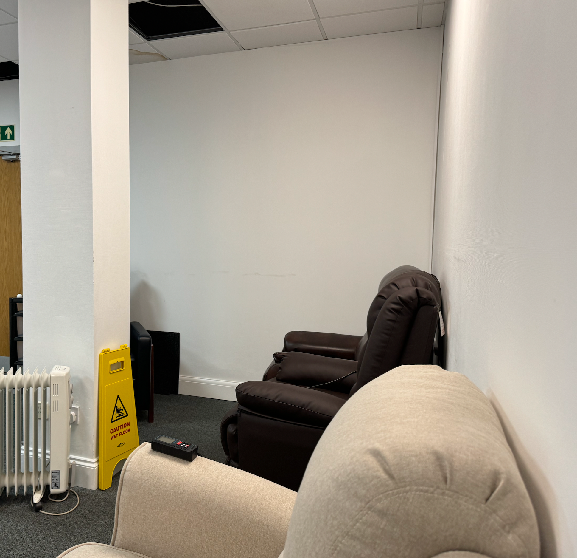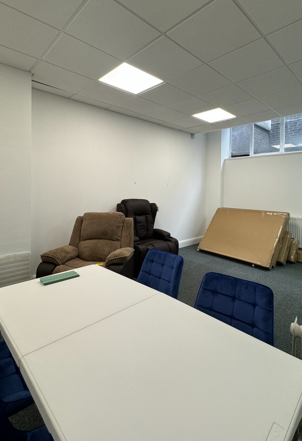We were asked to transform an unloved storage room in a Leicester office into a multifunctional breakout zone that could shift seamlessly from day to night use.