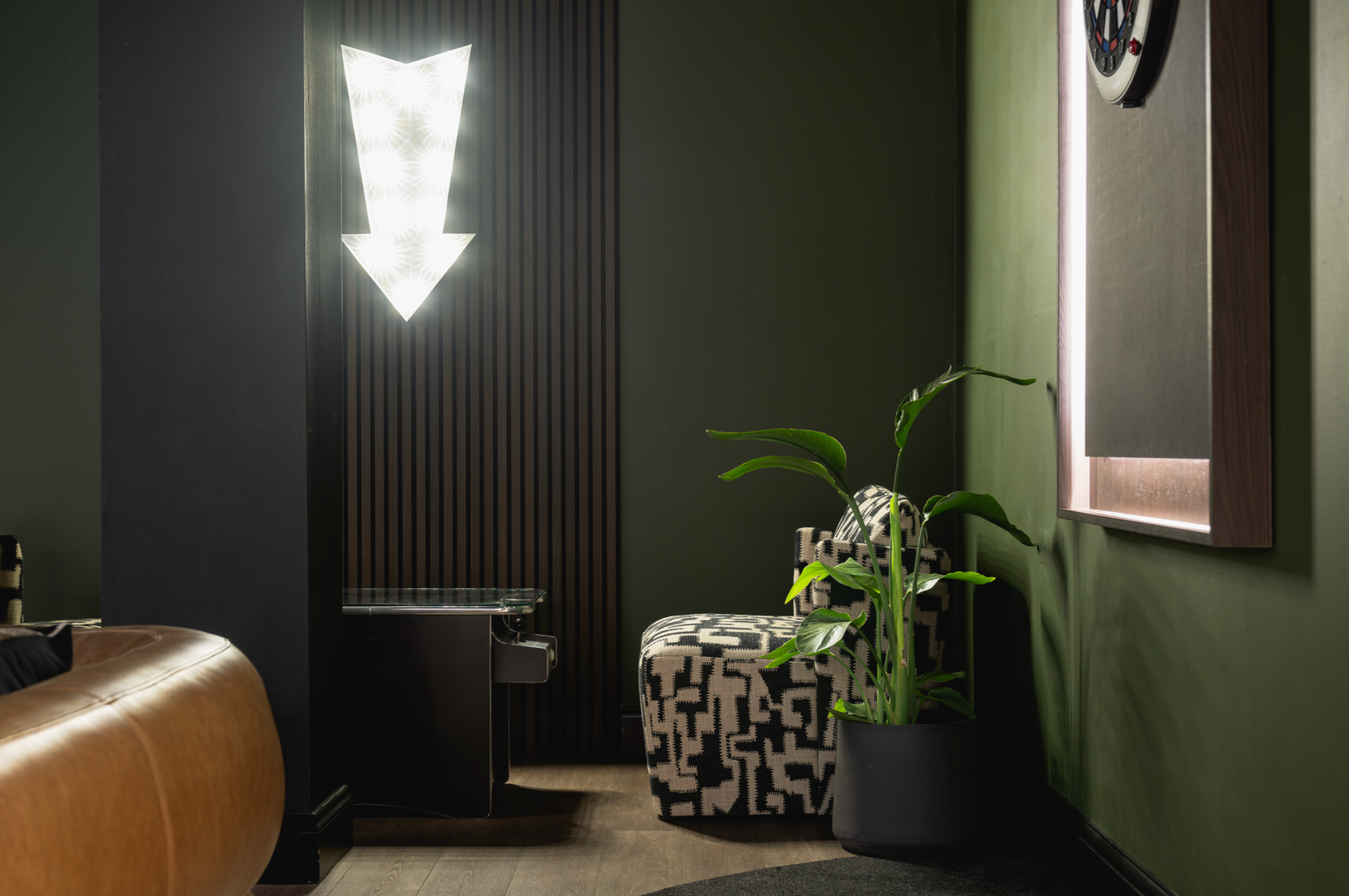 - A custom darts mat and illuminated arrow sign