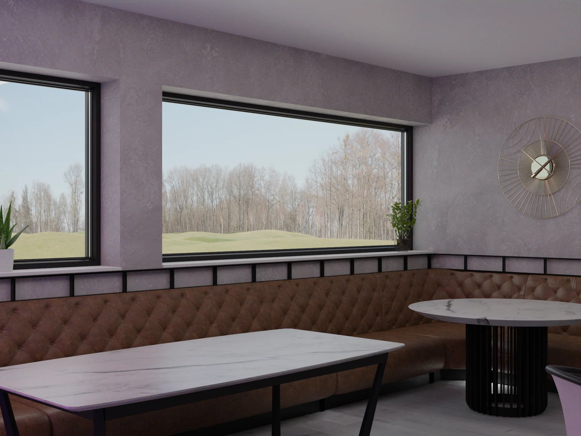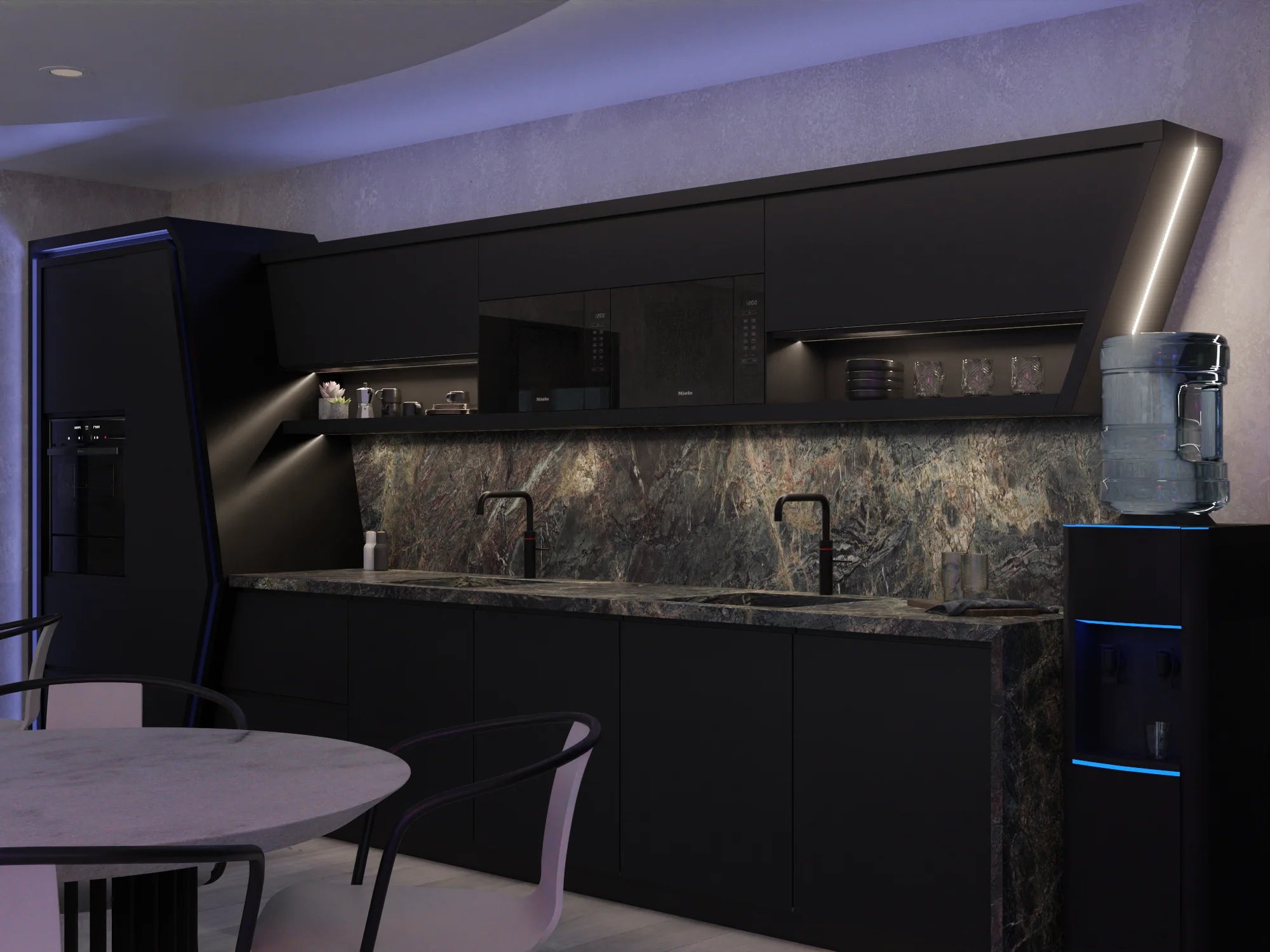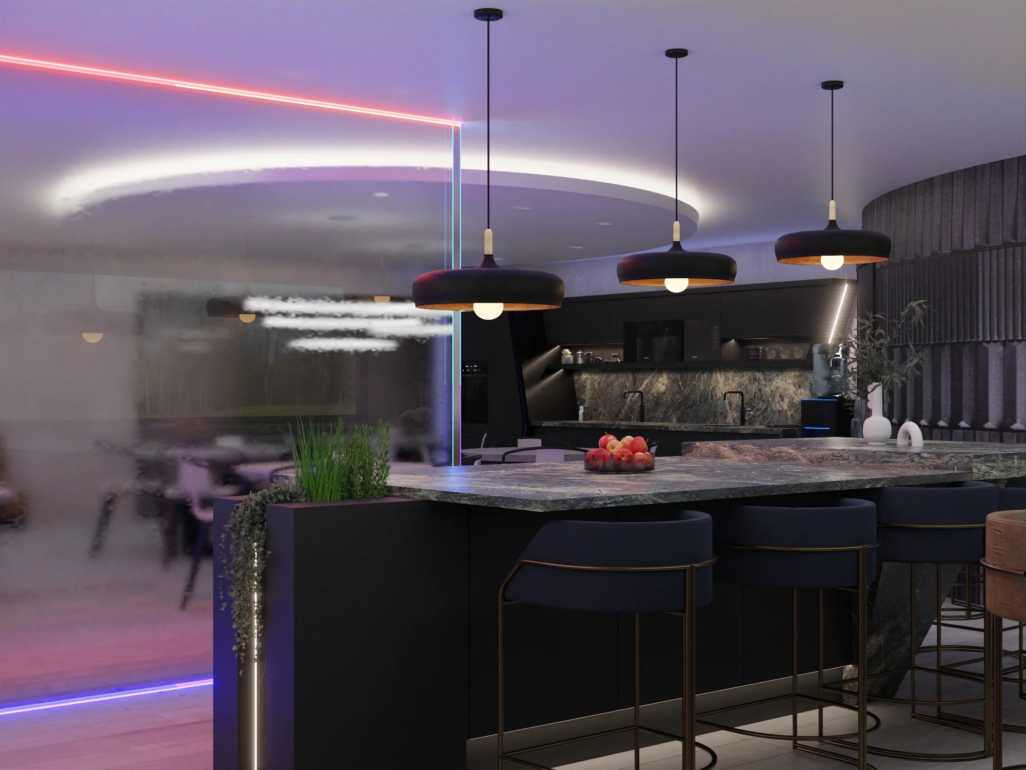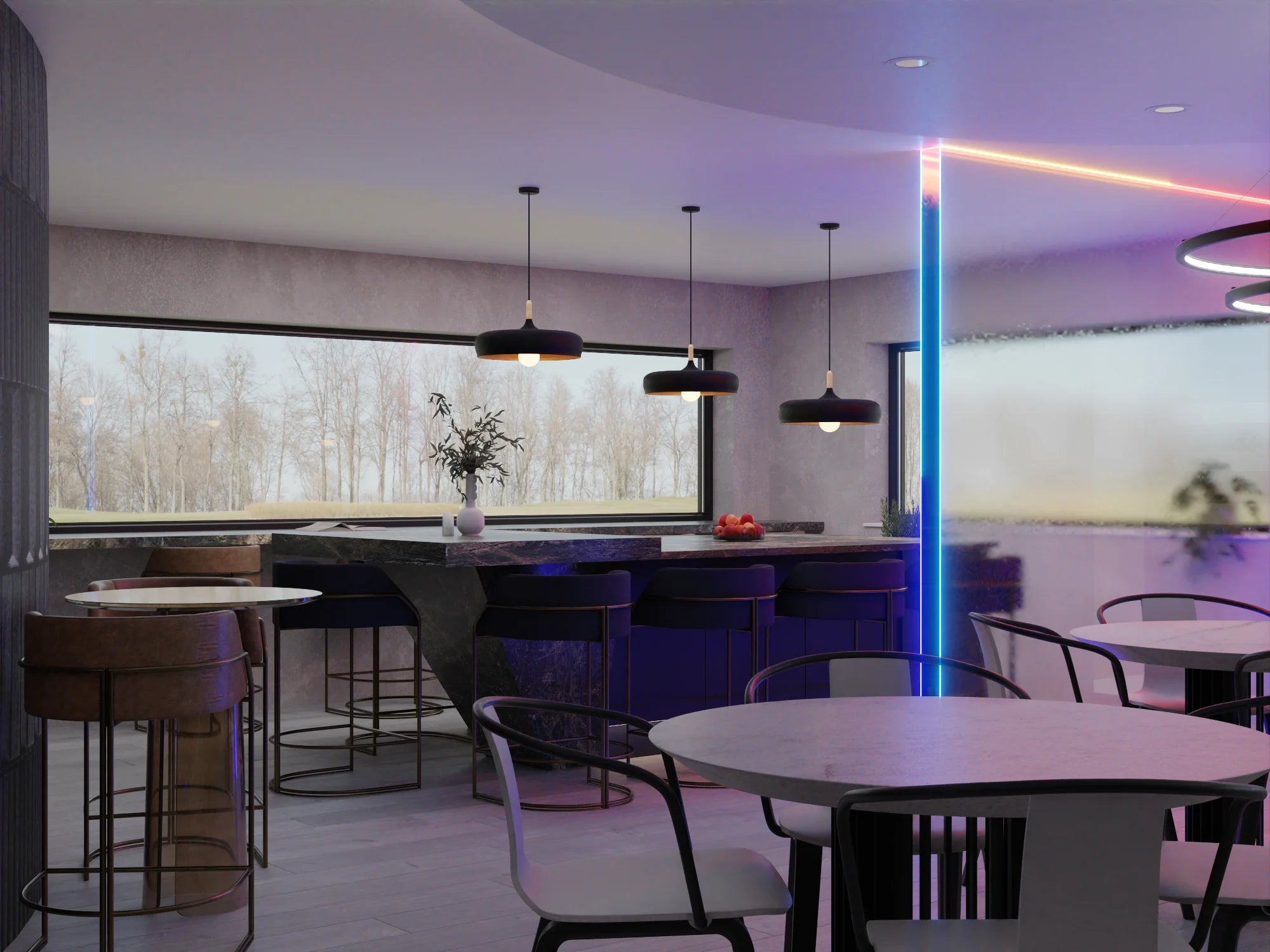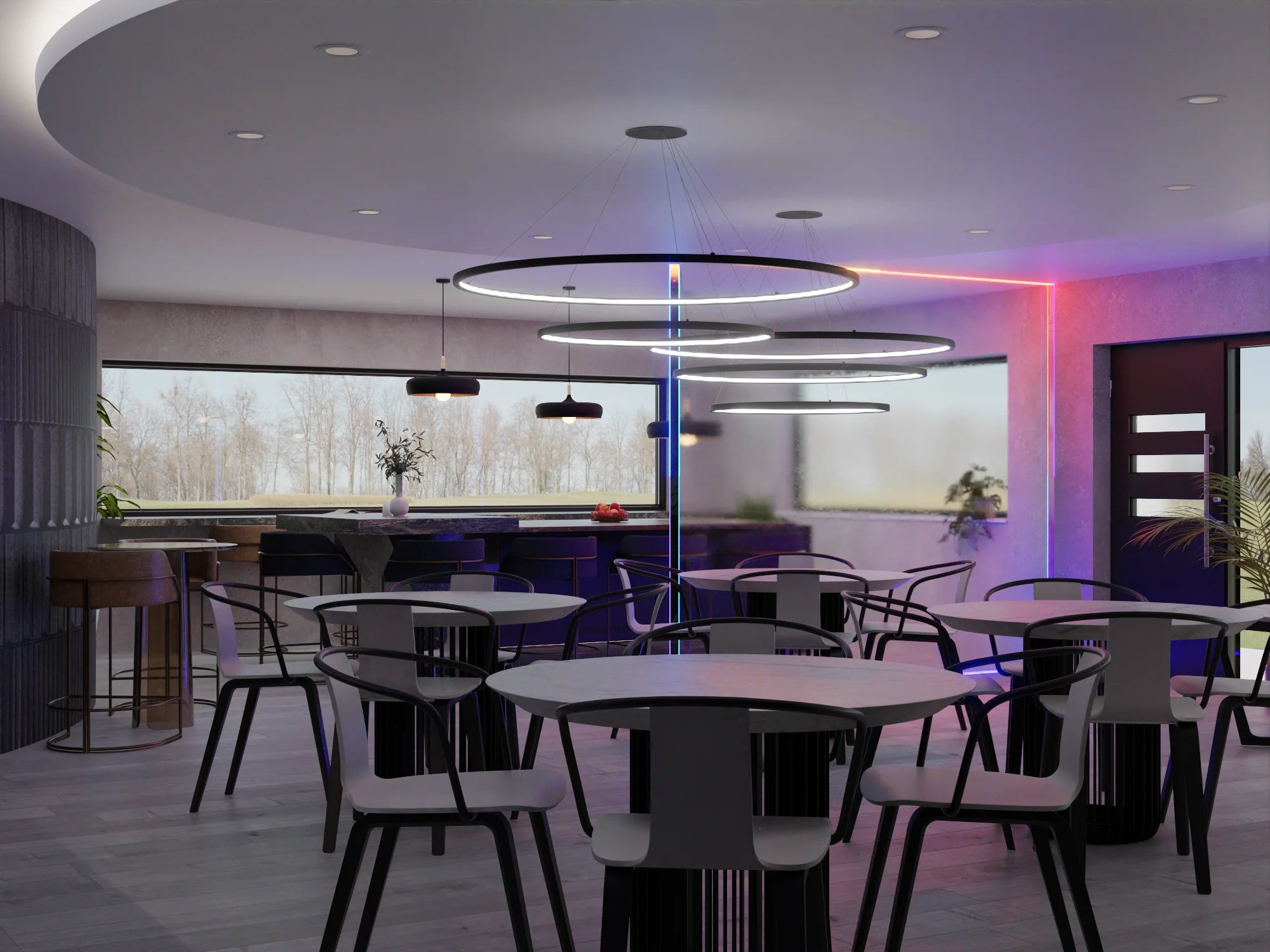 - A combination of ambient LED light and pendant lights to add interest and dimension to the height of the space