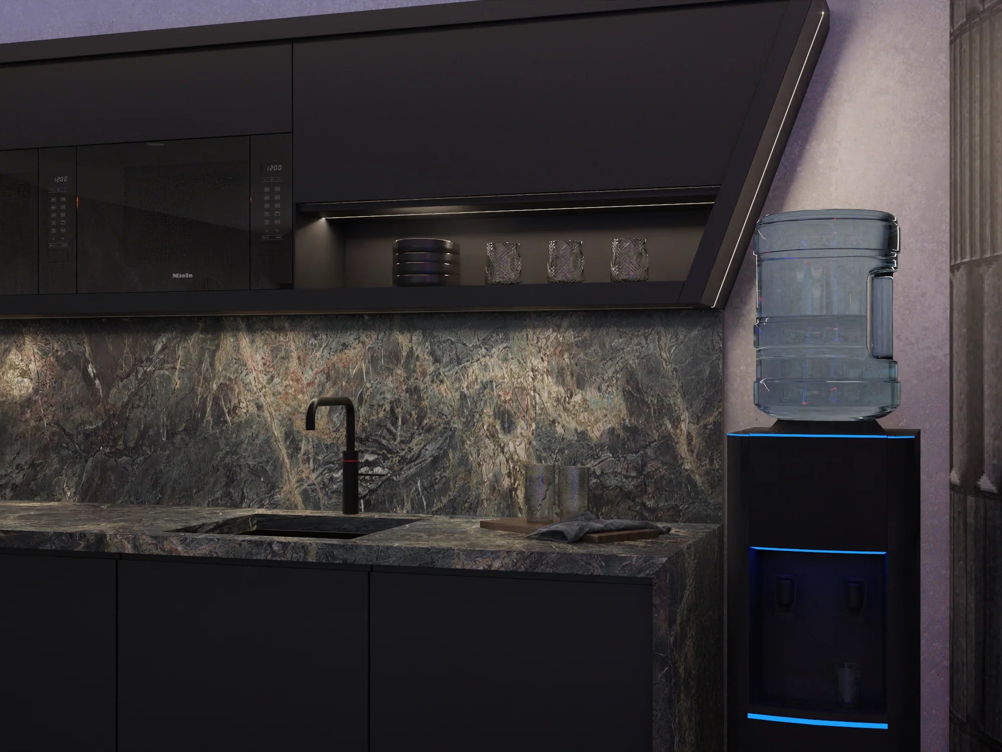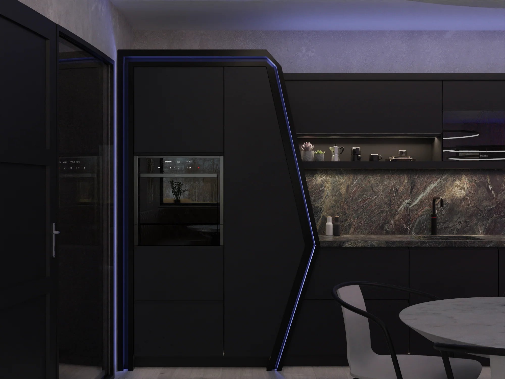 - Custom kitchen station with angular features and dual appliances to accommodate multi-use.