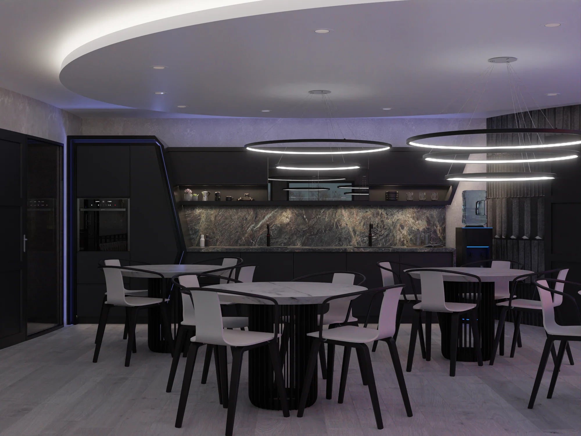 Workplace kitchen and dining area in a 400-person office. The brief was industrial yet timeless and futuristic, with blue, grey, black and white being the main colours. The space had to be functional with commercially suitable furniture and fabrics, as well as aesthetically in keeping with the rest of the office.