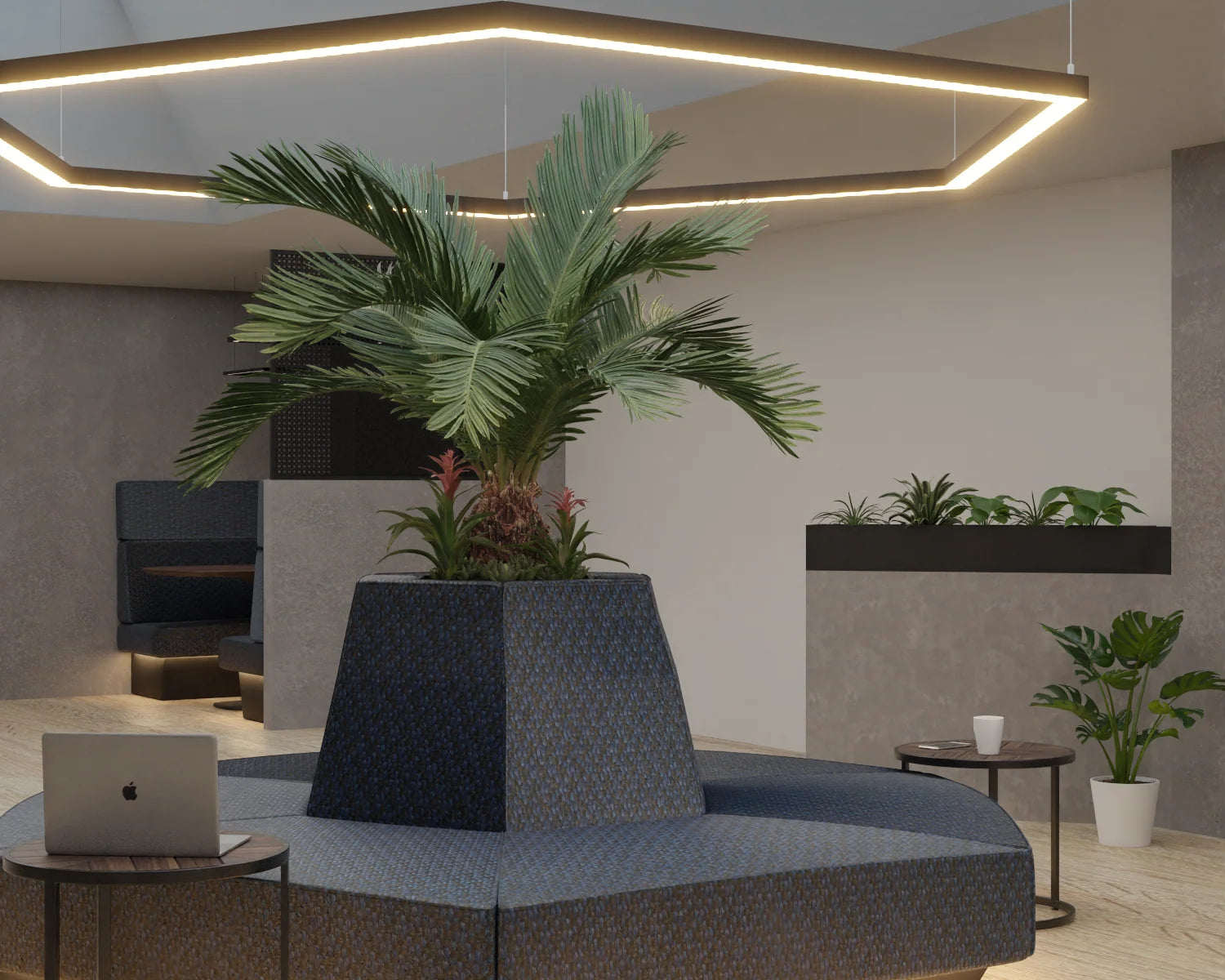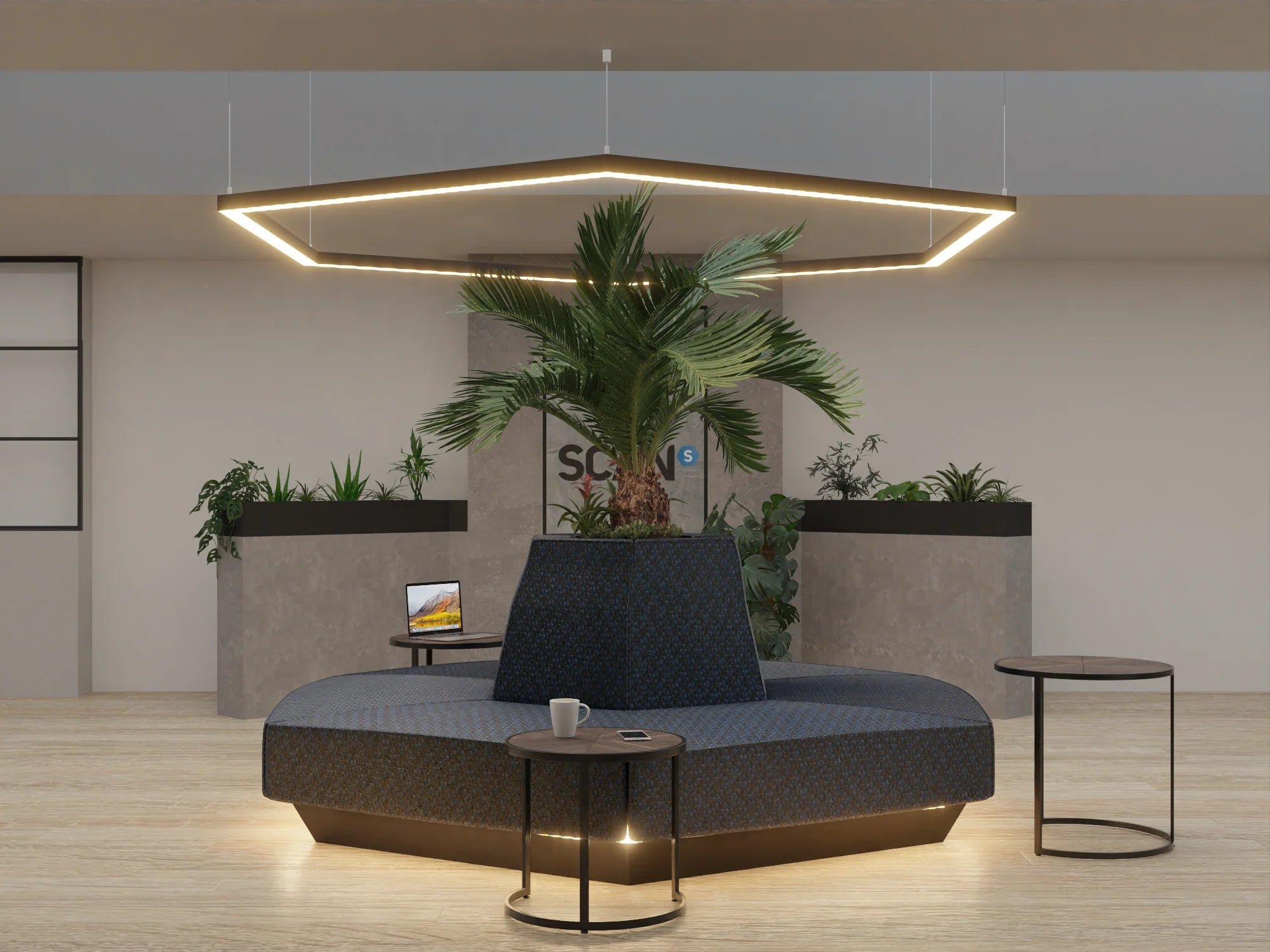 - Bespoke joinery hexagon seat / planter feature with custom suspended pendant light above