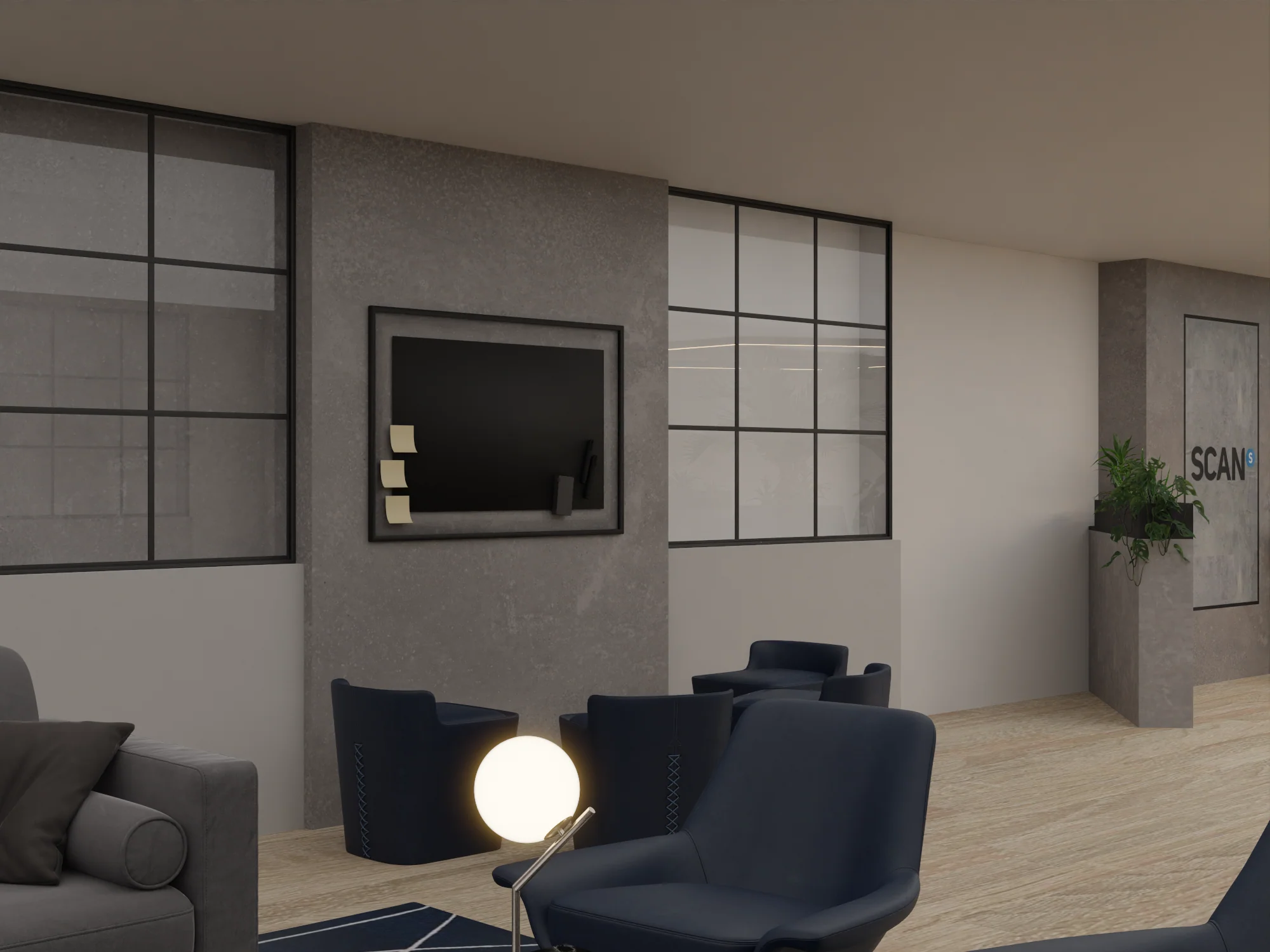 The layout includes lounge seating, layered textures, and warm tones that contrast with the industrial base palette used throughout the rest of the office. Acoustic lighting, soft furnishings, and biophilic elements create a calming corner within a high-performance workspace.