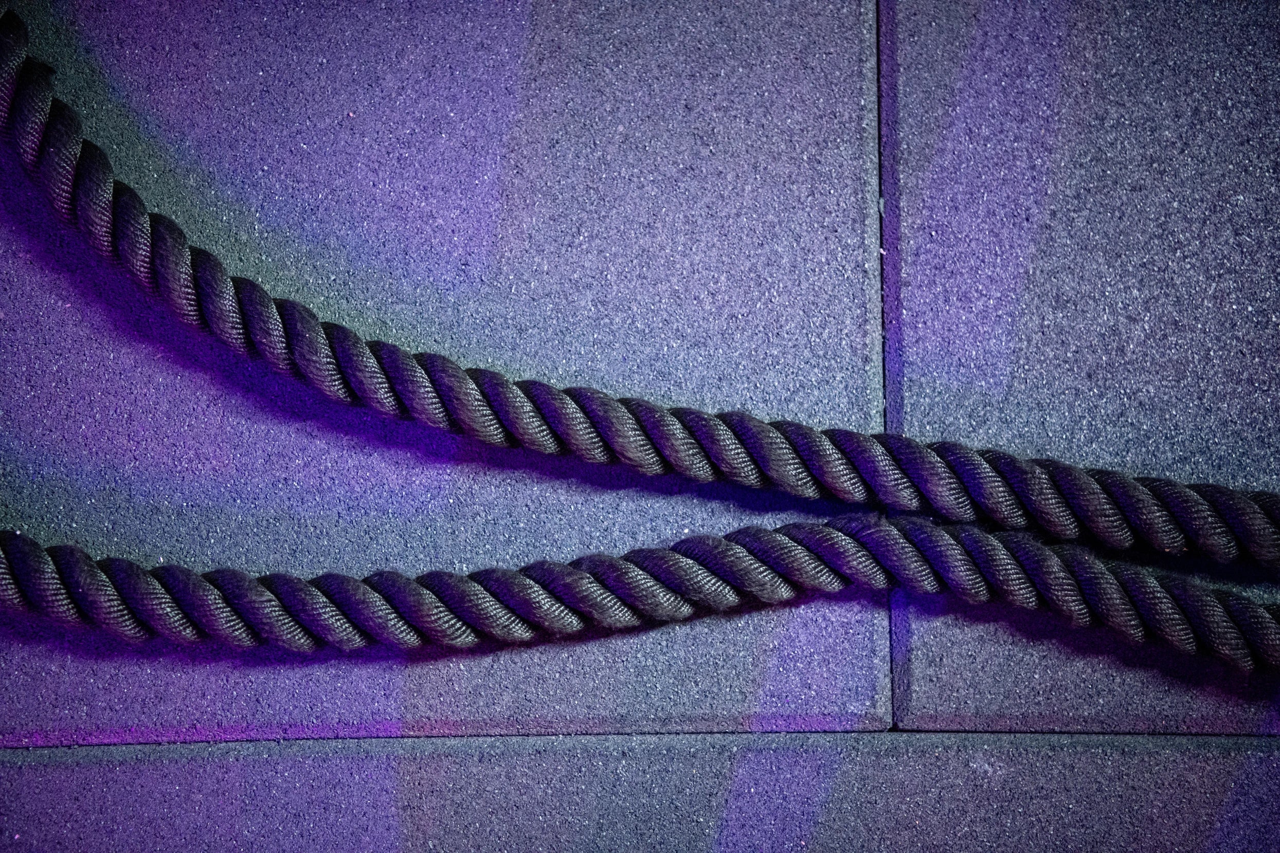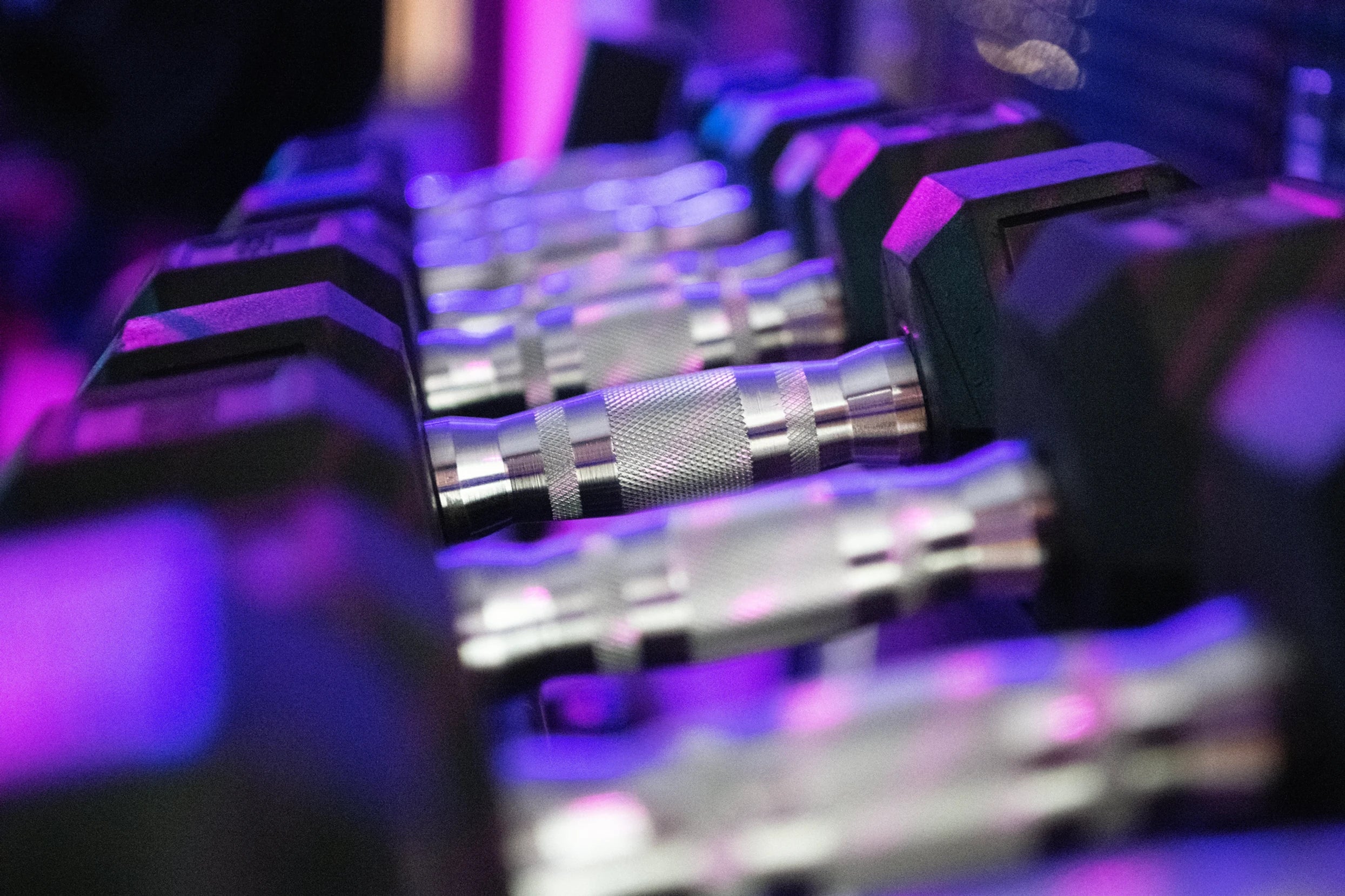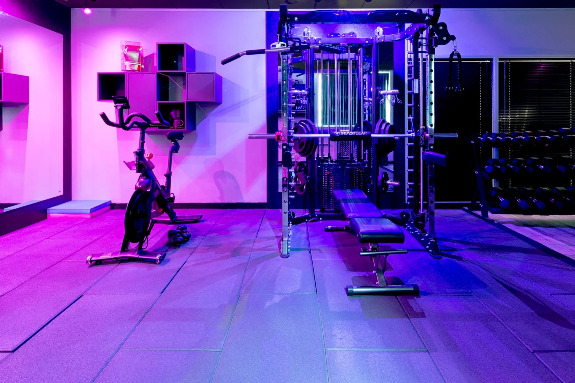 Key features include: multi-rack system machine, battle ropes, boxing bag, Olympic bars, 30-piece dumbbell rack, benches, Peleton bike and storage for boxing gloves, skipping ropes and wrist straps...