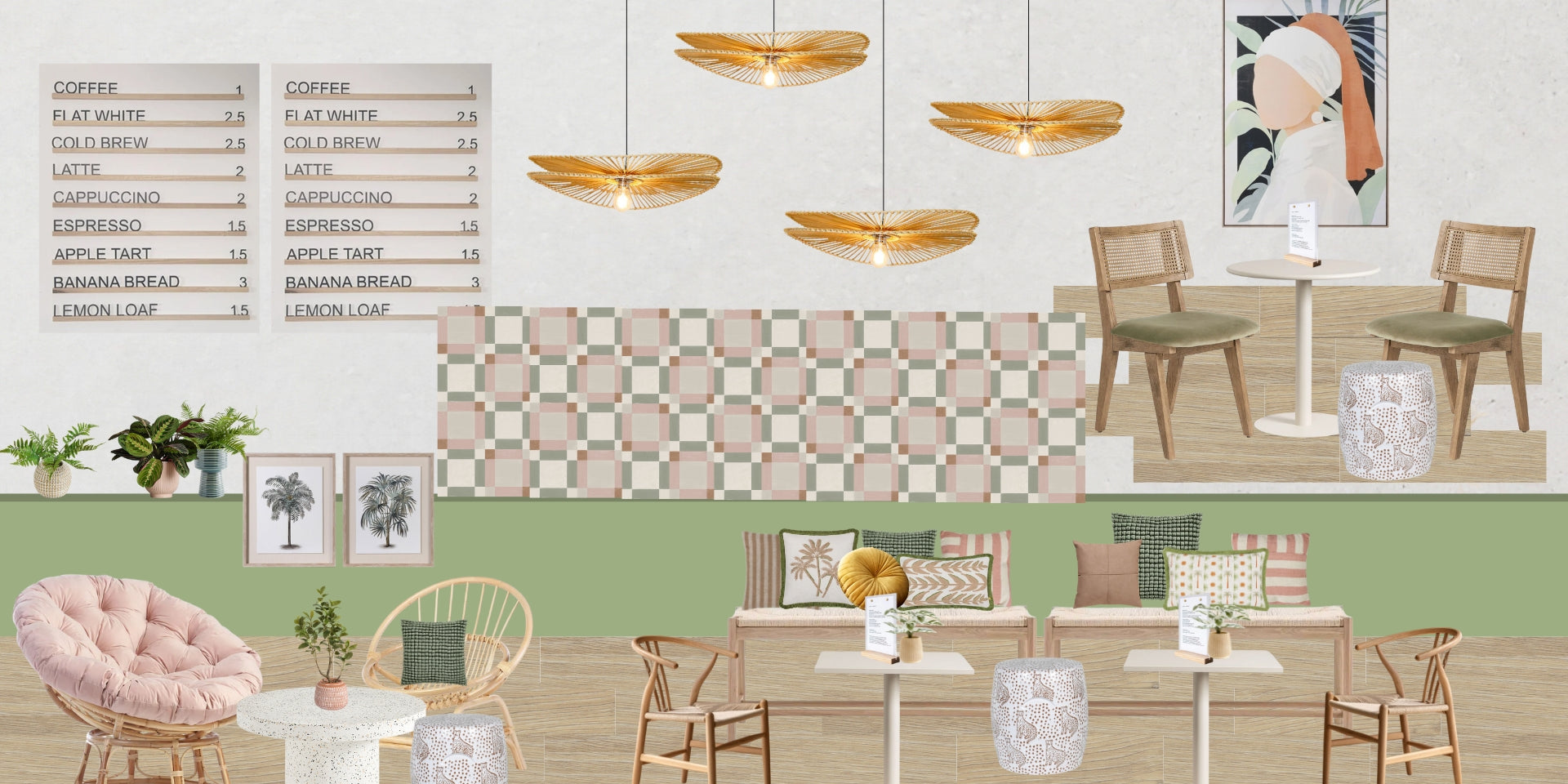 Sourced loose furniture, accessories, materials and lighting for the main cafe space. Featuring natural materials like light woods, woven rope and rattan as well as bold printed tiles and matcha green wall paint. Softened by limewash walls and muted soft furnishings, the concept feels fresh and inviting.