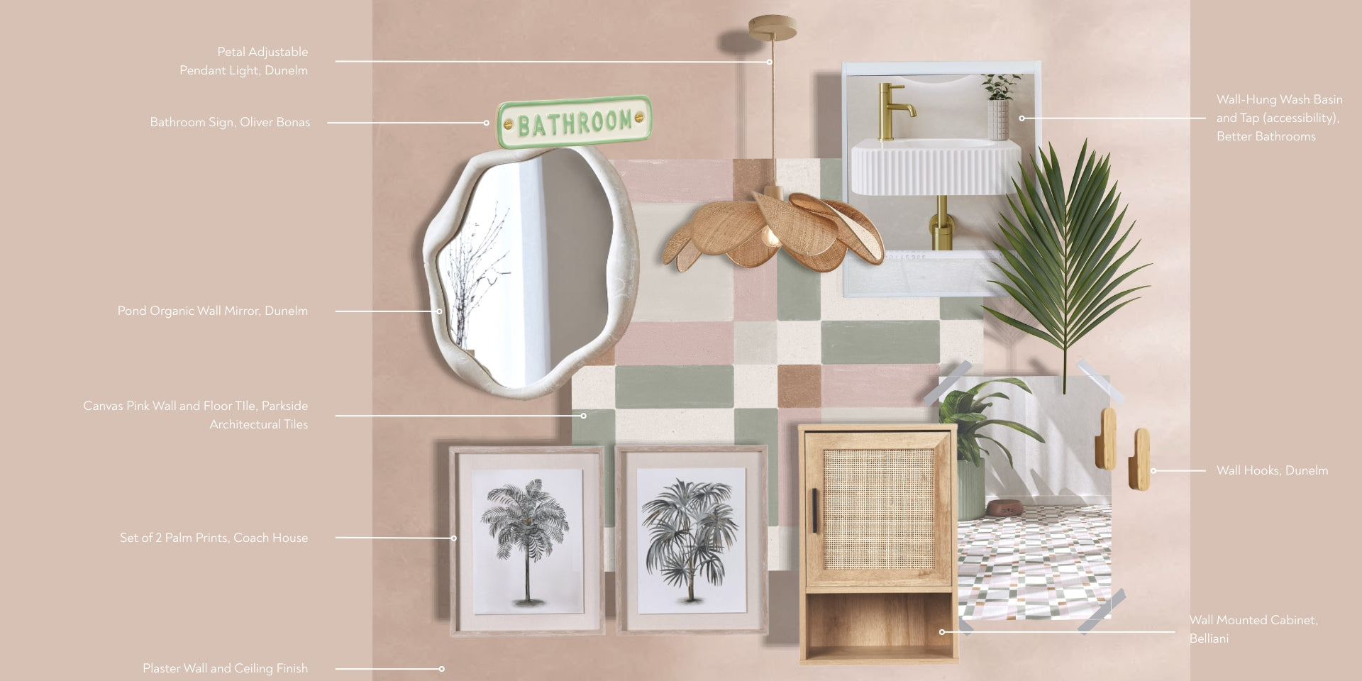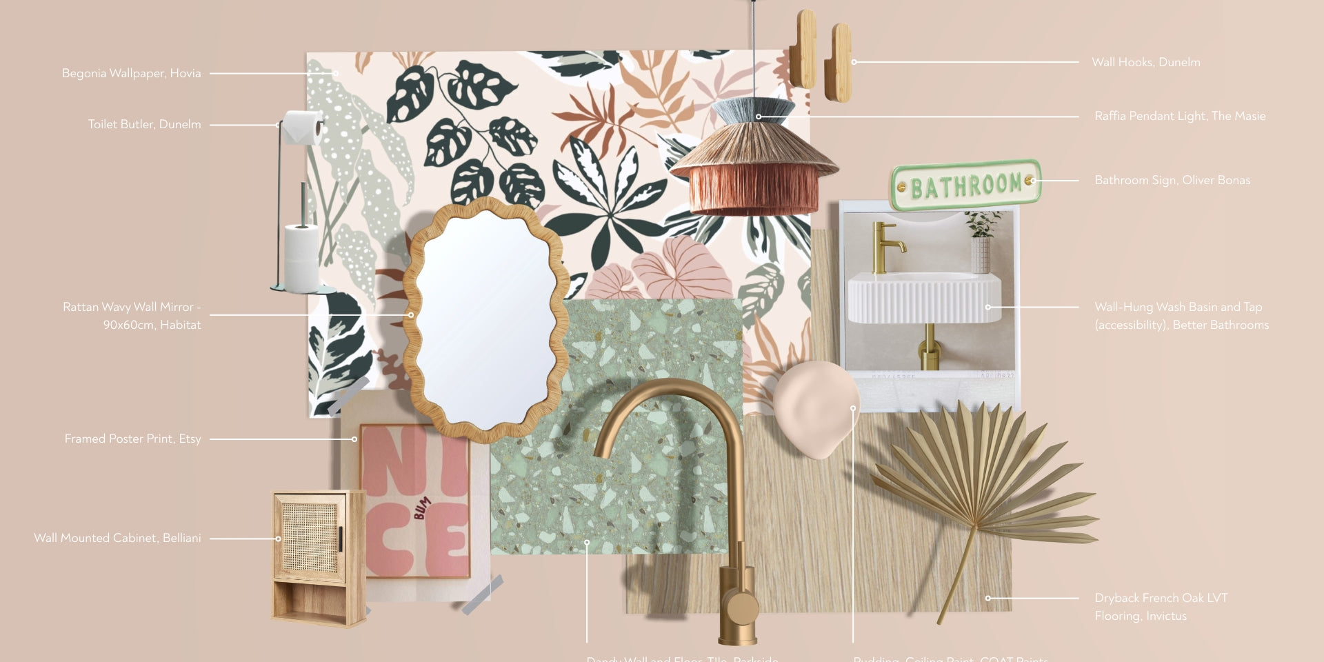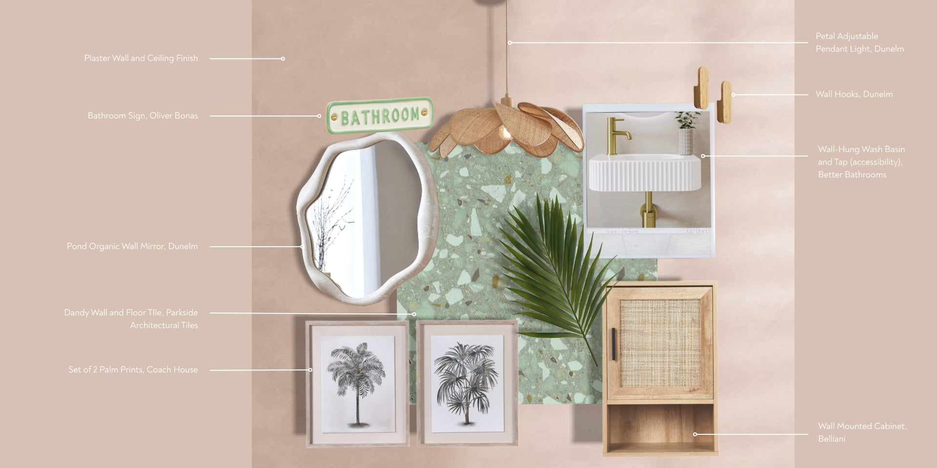 A digital material board created by us, featuring printed wallpaper, green terrazzo tile, rattan mirror and raffia pendant light for natural textures. This visual shows how the sourced materials and products work alongside each other in harmony. We share live links with the clients, but we can always assist in purchasing as well.