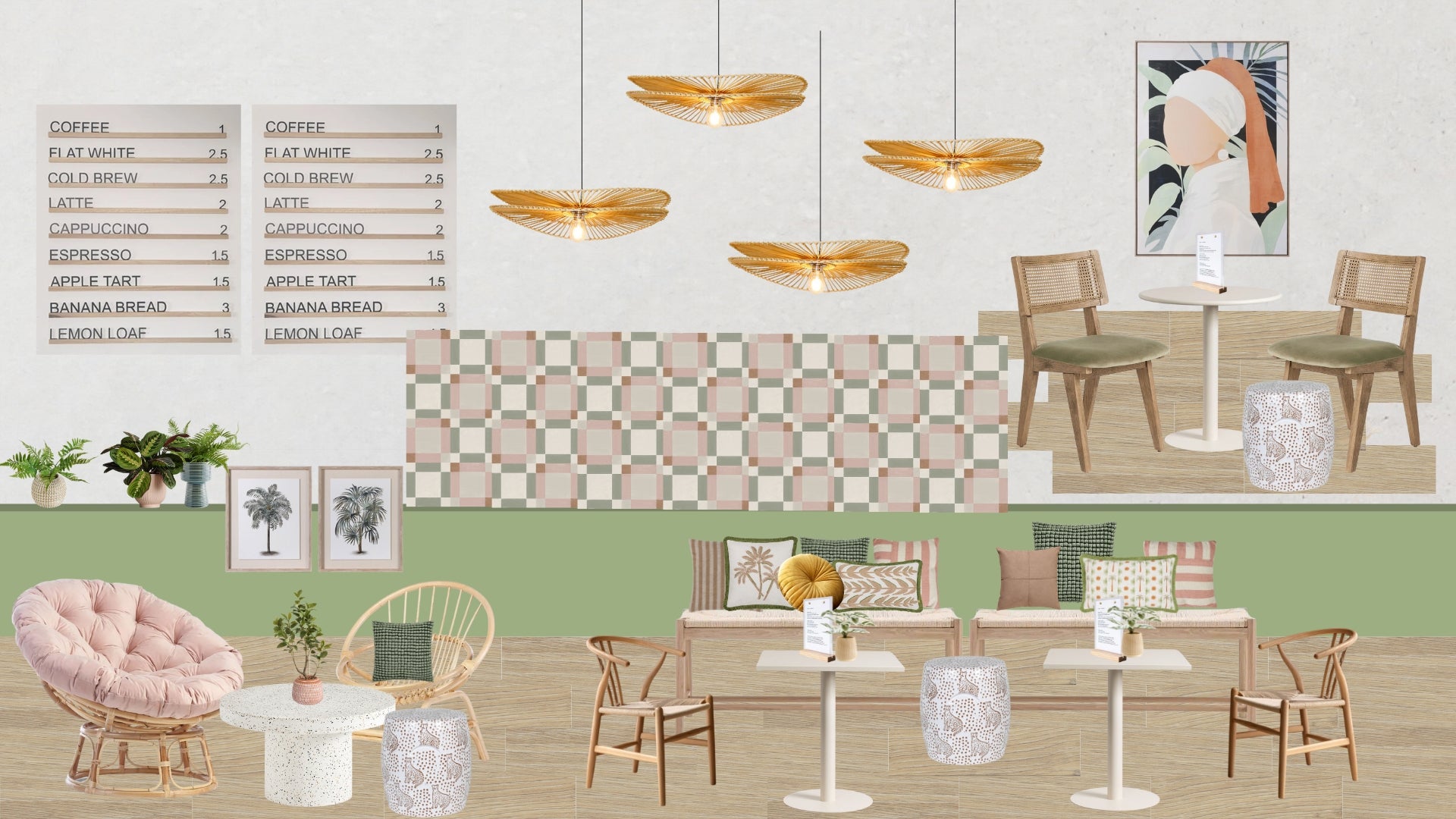 Sourced loose furniture, accessories, materials and lighting for the main cafe space. Featuring natural materials like light woods, woven rope and rattan as well as bold printed tiles and matcha green wall paint. Softened by limewash walls and muted soft furnishings, the concept feels fresh and inviting.