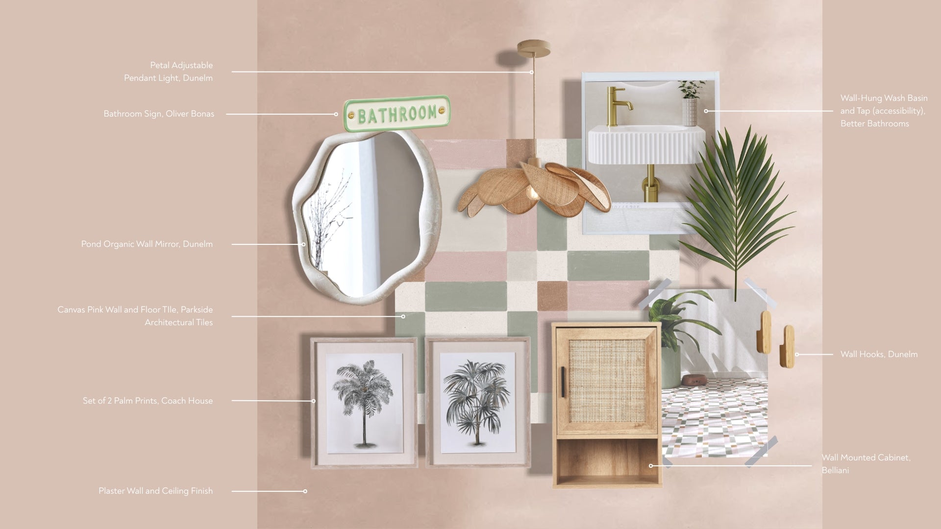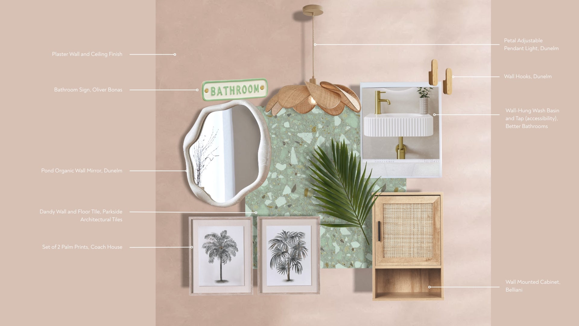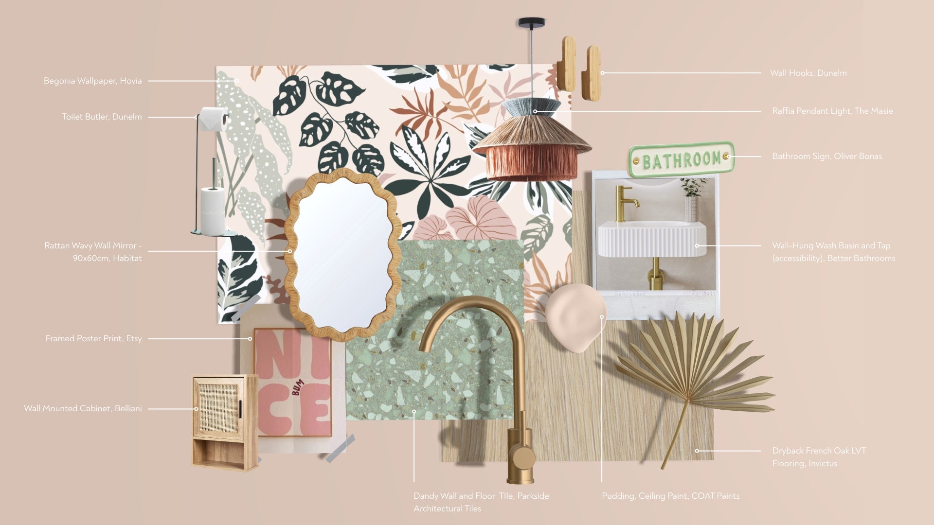 A digital material board created by us, featuring printed wallpaper, green terrazzo tile, rattan mirror and raffia pendant light for natural textures. This visual shows how the sourced materials and products work alongside each other in harmony. We share live links with the clients, but we can always assist in purchasing as well.