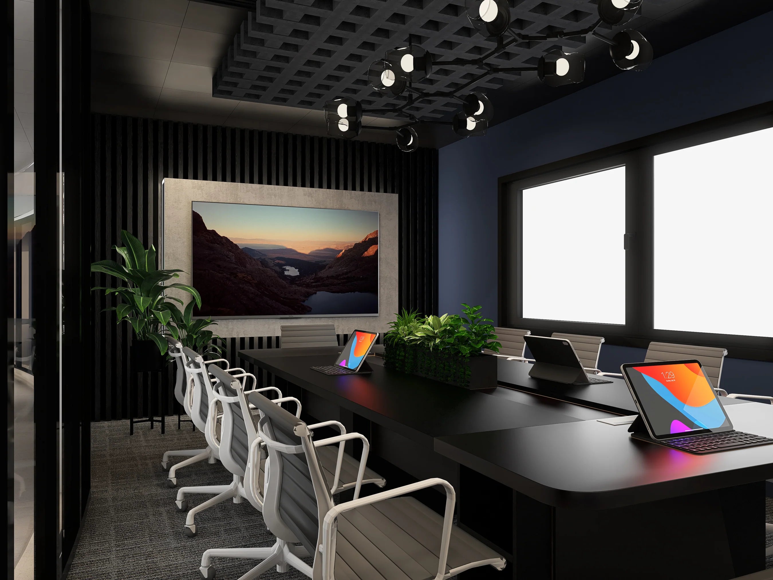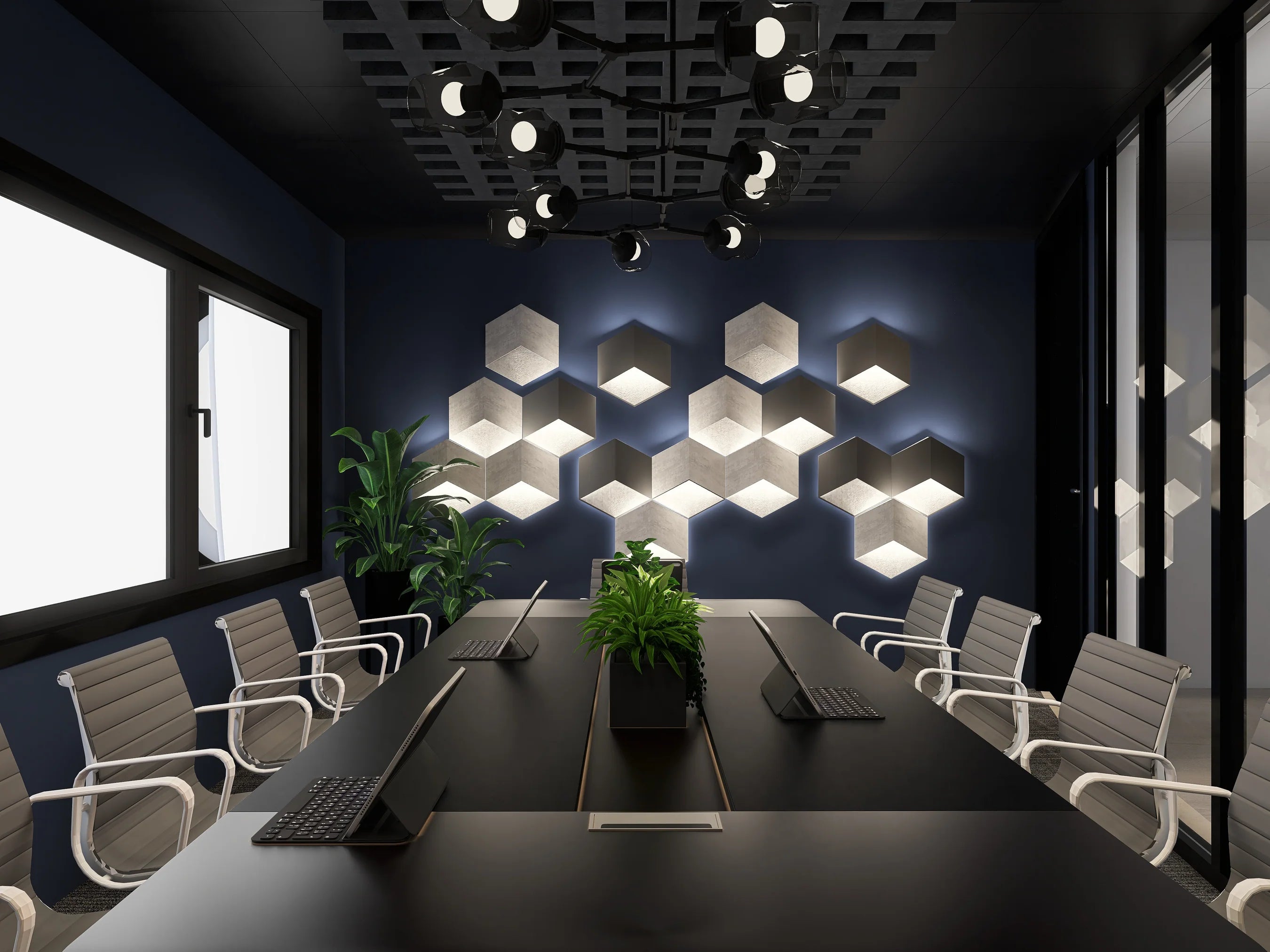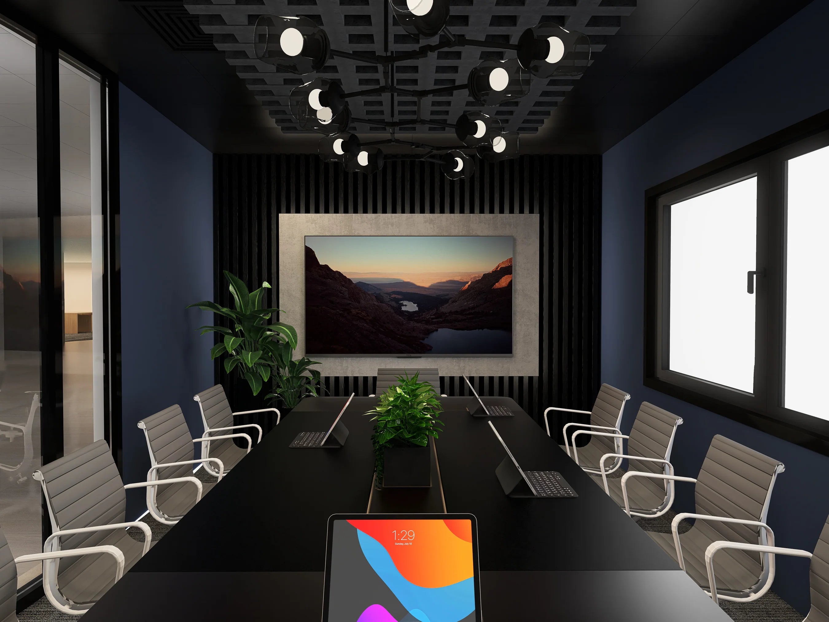 - 10-person meeting space with leather and chrome chairs