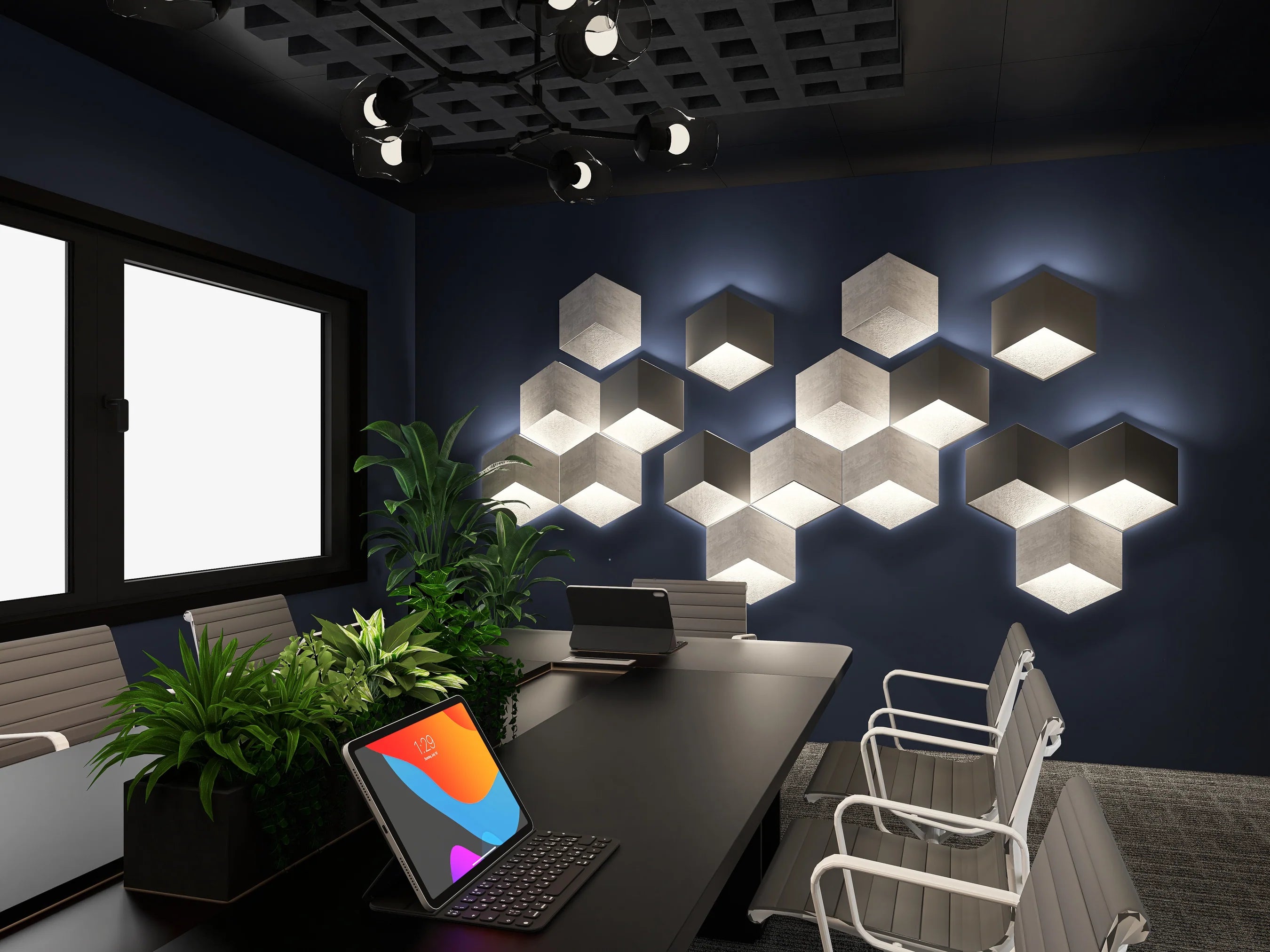 - Black acoustic raft in a grid design suspended from the ceiling